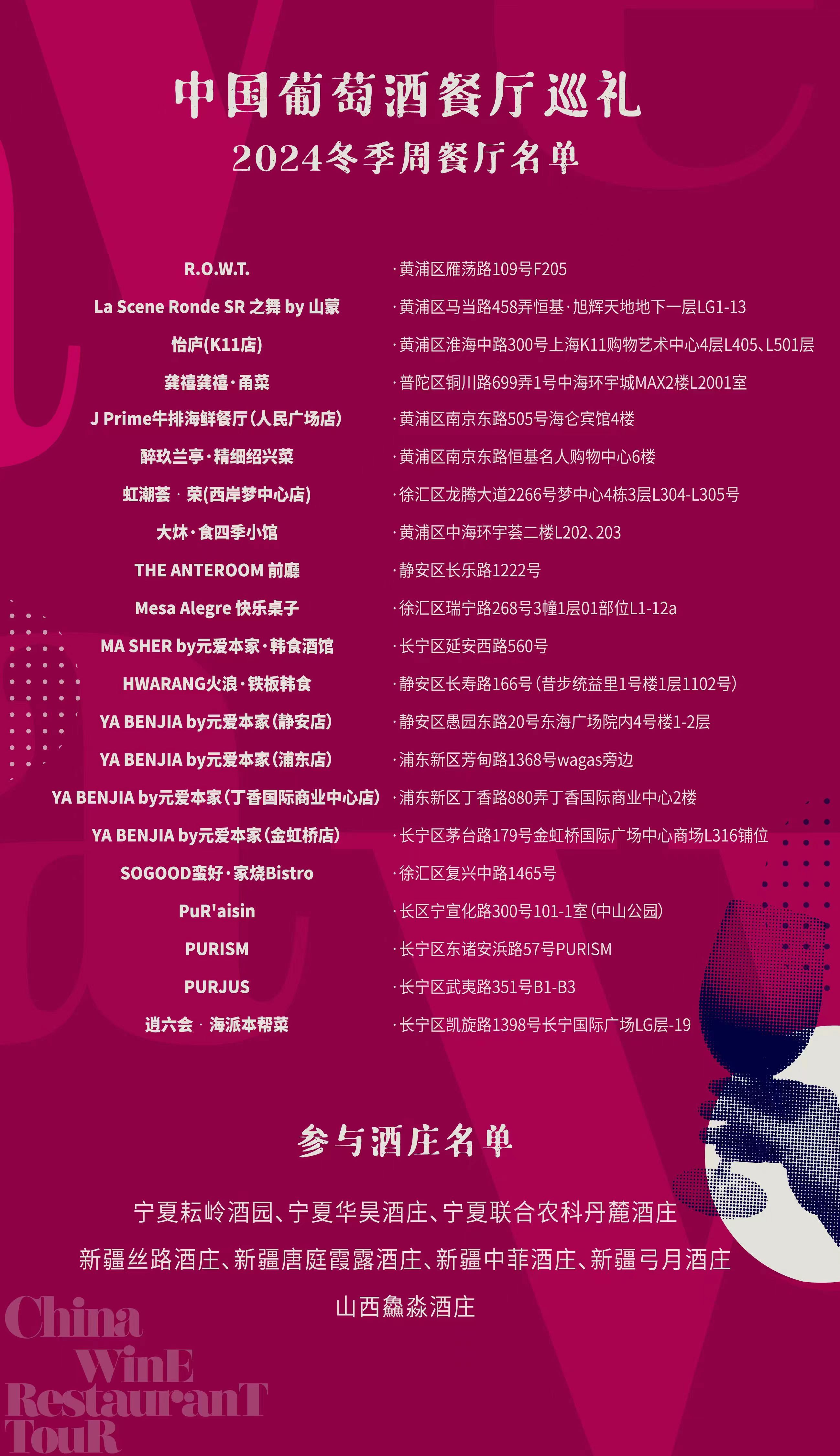 寒冬来临,一场主题为中国葡萄酒的美食美酒活动正式开启。自2024年12月15日起,来自中国三大产区的八家酒庄携手上海二十余家餐厅,开始一场中国葡萄酒与美食的对话,活动为期两月,至2025年2月15日,相伴跨年,共迎新春。