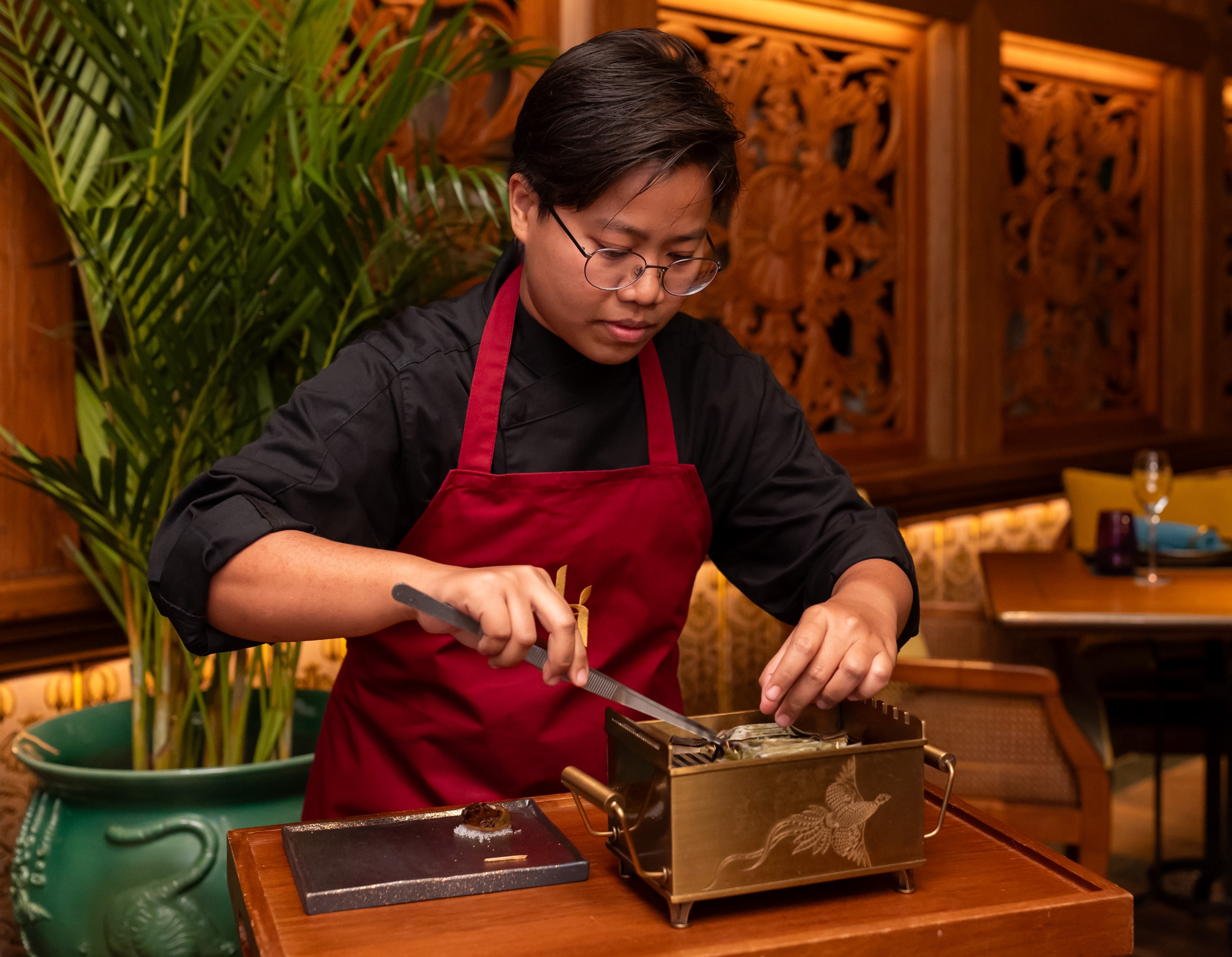 Nuch 主厨以两道佳肴唤醒食客的味蕾,包括槟榔叶龙虾,鱼子鲍鱼松饼——这道皇家小食以米粉制成鸟巢状饺子,内里是烤鲍鱼及鱼子酱。泰国首位米其林指南年轻主厨大奖得主Aom 主厨则呈献了她的招牌菜式之一,以香蕉叶包裹的稻蟹糯米卷,香气浓郁,风味独特。两位富有创造力的主厨也共同创作了多款佳馔,包括脆麟马头鱼配海蓬子蚂蚁蛋沙拉,令饕客赞叹连连。每晚的美食体验都以现代手法巧妙致敬泰国料理传统,每一口皆是难忘的味觉记忆。