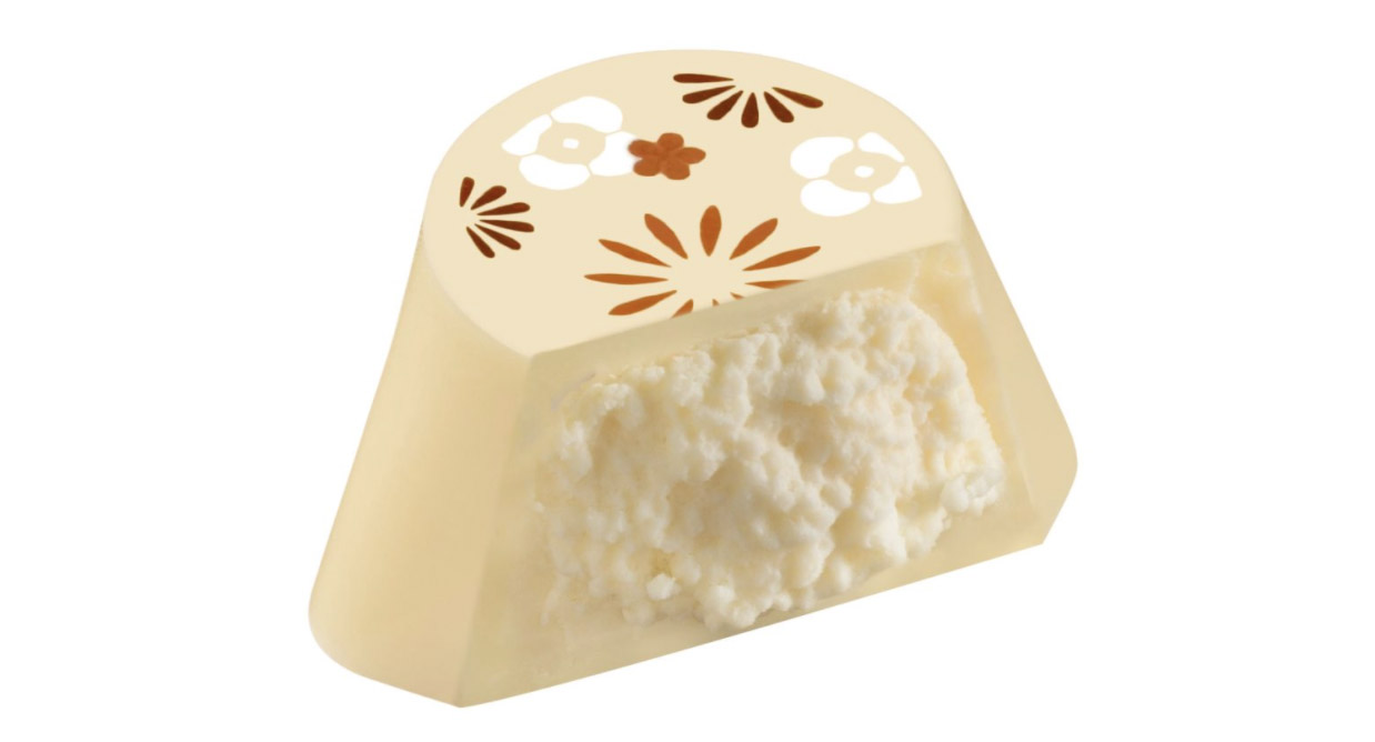 巧克力顶部的图案灵感源自春日花朵,加以芬芳的巧克力香气,蕴藏对美好新年的第一缕期许。深邃醇厚的黑巧克力外壳中,包裹住甜杏汁、扁桃仁和饼干融合而成的香浓酱芯,造就平衡口感。
