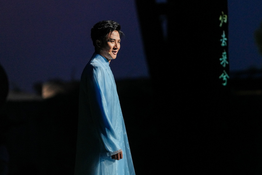 在道艺合一的“优人神鼓”祈福鼓曲,以及昆曲王子张军的悠长唱腔中,养云村民艺术表演拉开了艺术季的帷幕。光影和时间都暂时凝聚在了大树上。昆曲水磨新调对话古今,小号与箫对话东西,养云在艺术的视角下,续写了陶渊明笔下的《归去来兮辞》。