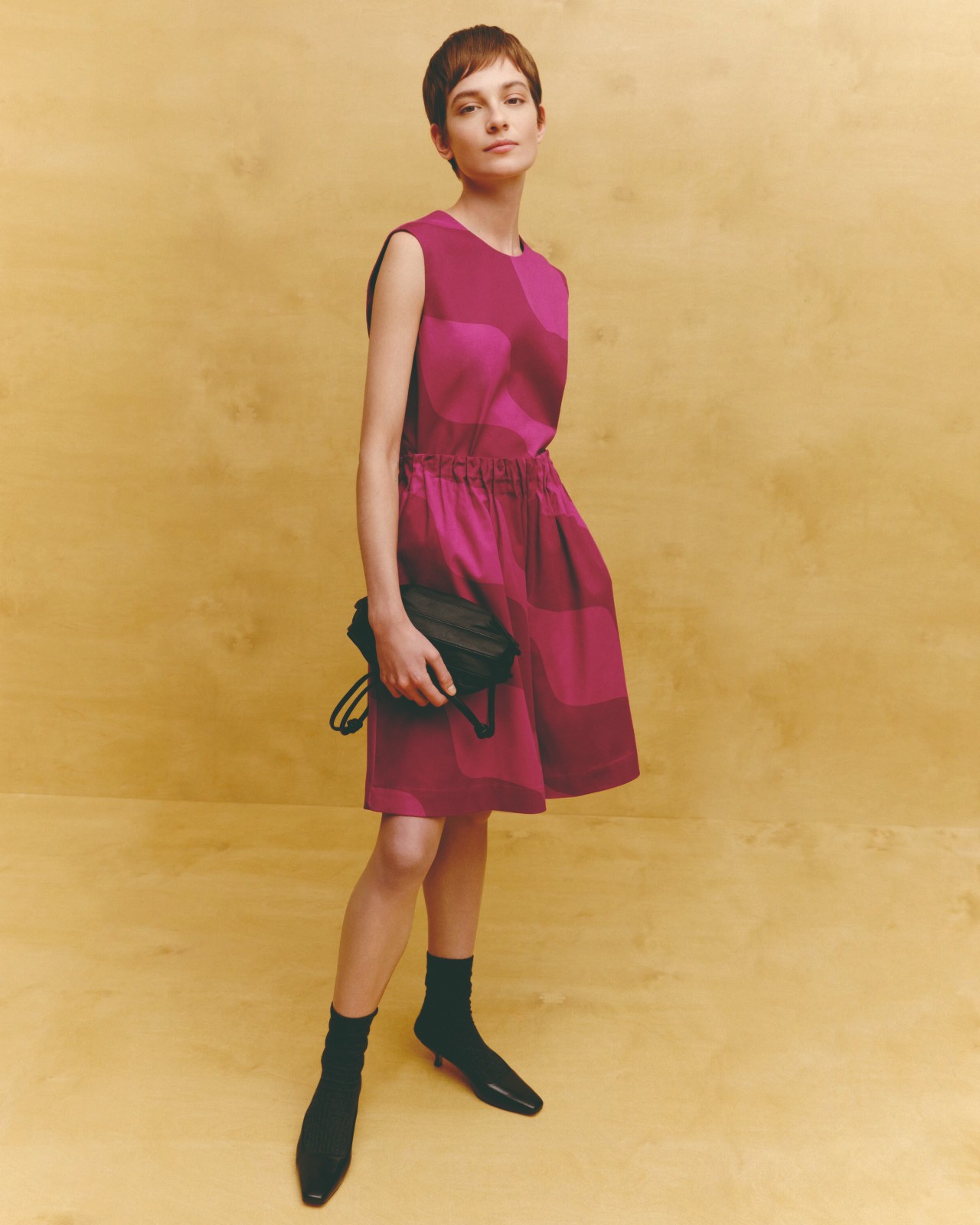Marimekko 2023早秋系列采用了通过国际认证的有机面料,以及再生环保面料。再生莱赛尔纤维是从天然植物中提取的纤维,其生产过程与普通菜塞尔面料相同。与生产传统粘纤面料相比,不仅不使用有害化学物质,而且对水资源的消耗更小。此外,Marimekko还运用了100%铜氨面料,这种具有真丝质感的材料由生产棉织品过程中产生的棉短绒线加工而成。与真丝相比,生产铜氨纤维对环境的消极影响极小,但两种面料的特点与品质却十分相近。