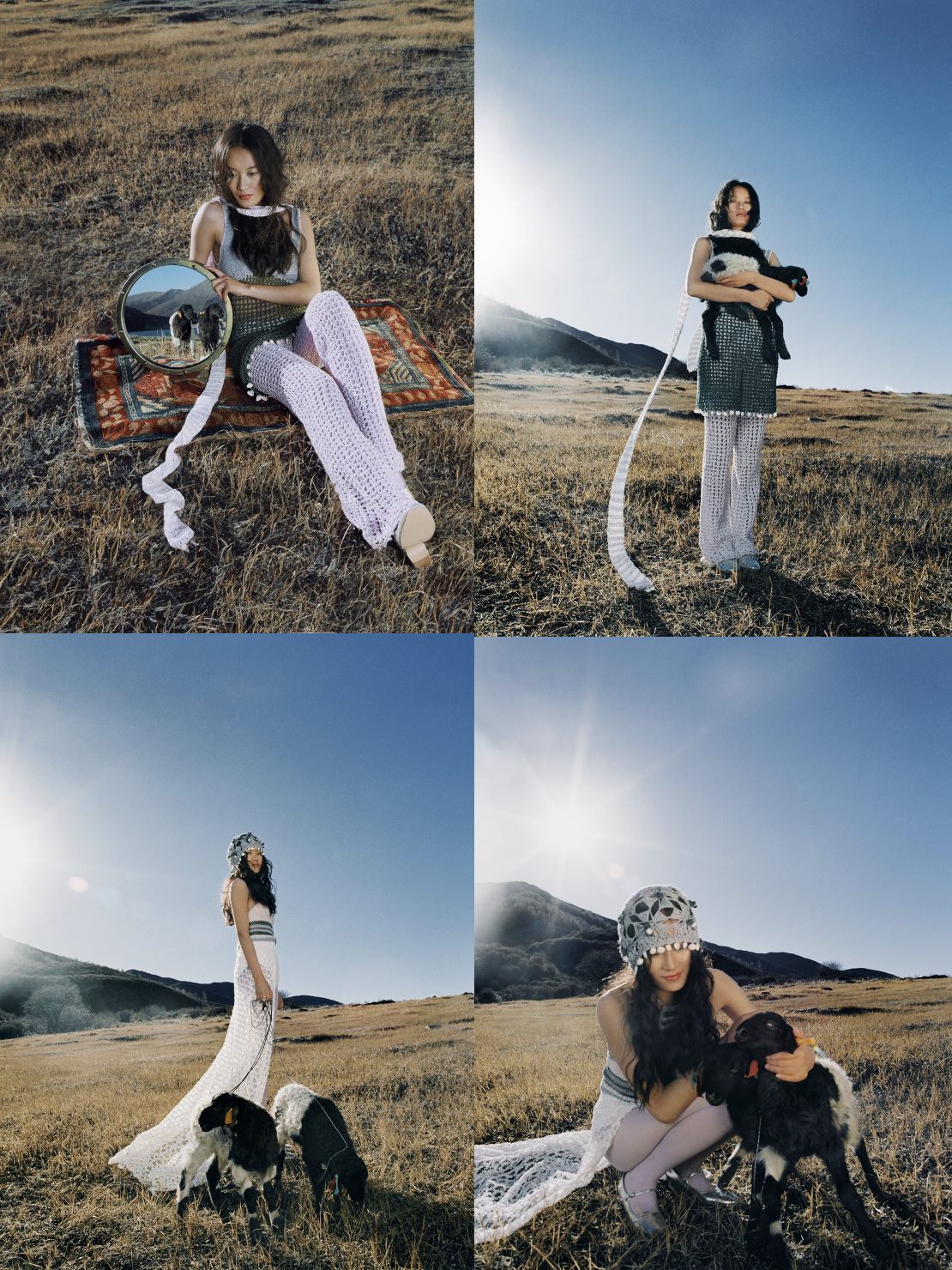 ZI II CIIEN则将注意⼒聚焦于现代⻛格对话传统⼿⼯艺后产⽣的碰撞,以品牌的设计语⾔重塑之。设计主题灵感源⾃⻘海的⼭海元素,通过采⽤隐喻森林和湖⽔颜⾊的纱线,以及少量梦幻感的、隐喻都市海边的⻉壳元素,表达着设计师对⾃然的深厚情感。设计师从当地特⾊刺绣与钩针床品中提炼⼿钩技艺,巧妙地为材料创造出丰富的纹理,以当地特⾊的花卉⾼原杜鹃为主要原型,每⼀件作品都是对传统⼯艺与现代设计的完美融合,呈现出⾃然优雅,轻松⾃在的设计理念。