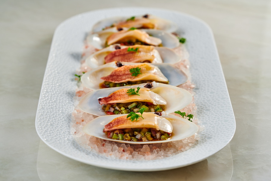 东海黄鱼与油带、南海竹蛏与白贝、西沙群岛野生鱼类……四海小鲜聚齐,搭配潮汕金不换、东北老虎菜,调味手法在油泼辣子与油醋汁之间,自由切换,中国海岸线上的独家甘甜,如画卷在舌尖延展。