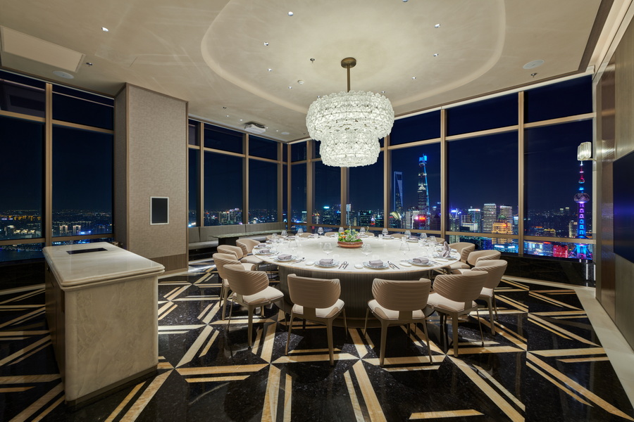 SELECTION BY DU室内设计由杜建青先生与品牌设计师共同演绎,将菁禧荟传统的空间线条元素,解构重塑,以中西融合的现代风格,打造优雅松弛的用餐空间。设计团队花费半年时间,将巨幅订制款米兰黄玉、皇家白玉,镶嵌于餐厅墙壁,天然云石纹路与窗外浦江天色,遥相呼应。大厅与走廊地面,以安哥拉棕镜面拼花工艺,呈现菁禧荟品牌暗含的序列感。客人步入其间,浅色及金色系玉石营造出温润、儒雅的质感,简而不凡。