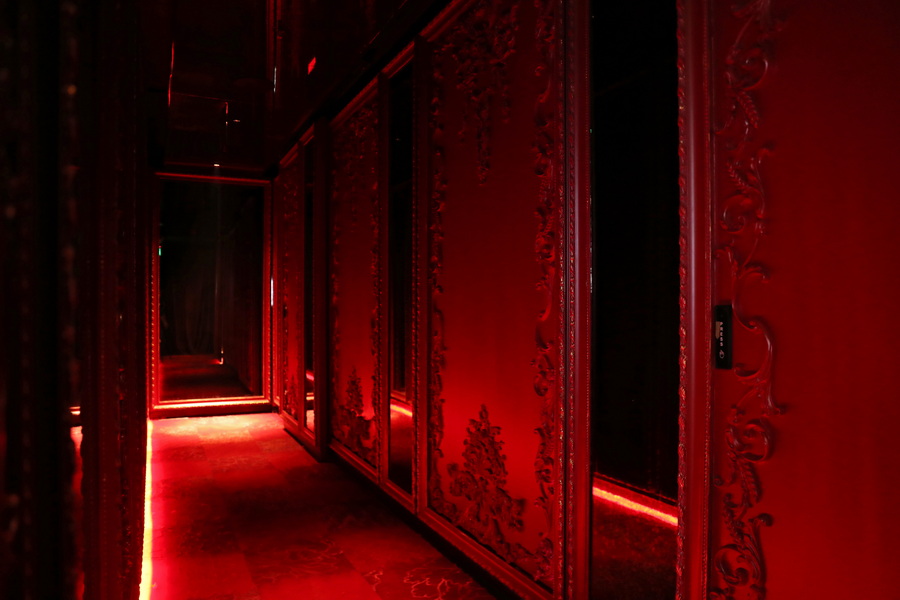 餐厅入口处,被设计为一条昏暗却华美的走廊,艳丽的红色、神秘的黑色和点缀其间的高贵金色,以及在走动的光影变化之间清晰呈现的繁复浮雕,似乎都在诉说一个关于时间和过往的故事。穿越走廊虽只需短短几步,却似回溯了时光,就连心情都会一同沉静下来。