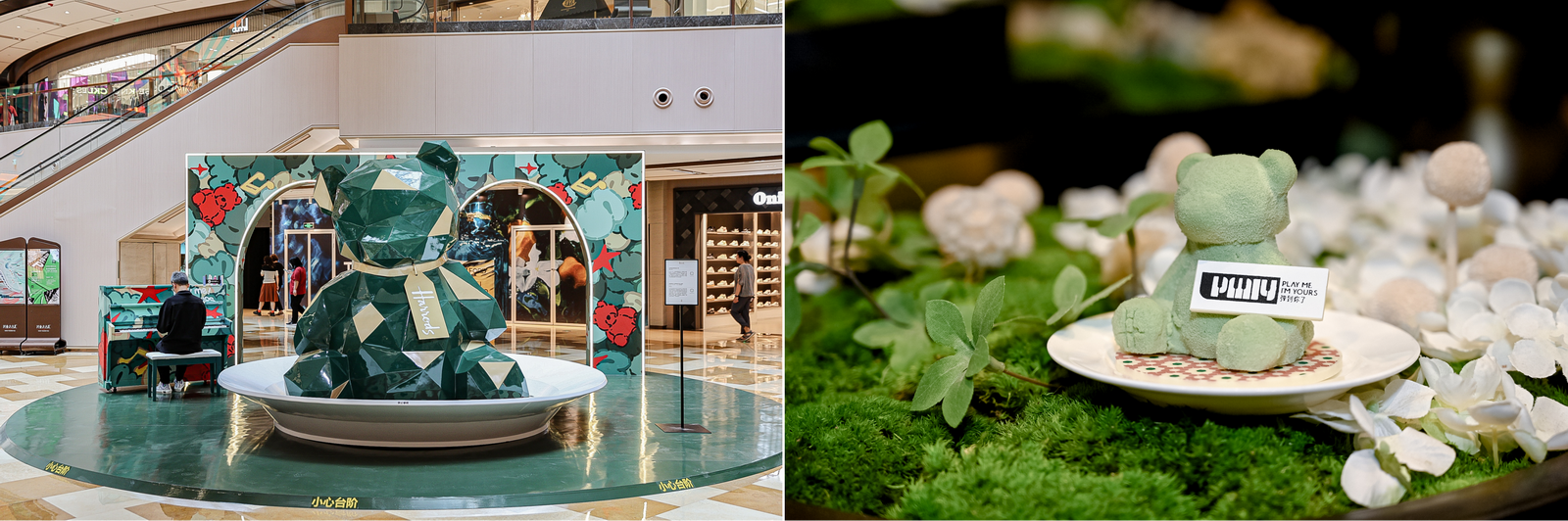 为解锁艺术钢琴的更多表达形式,兴业太古汇还特别邀请两家场内品牌打造创意钢琴。其中,哈罗德(Harrods)于LG1中厅呈现《伦敦印象》(London Calling),通过当代涂鸦艺术家如拉(RULA)的创作,让ROSMICAL宇宙粒子自由聚集于琴上,同来自英国伦敦的哈罗德小熊CHA-LIE一起沉醉于美妙音符。与此同时,上海哈罗德茶室还将小熊CHA-LIE形象带回夏季下午茶菜单,与“Play Me, I'm Yours 弹到你了”梦幻联动,邀所有热爱音乐的朋友一同臻享味蕾乐趣。