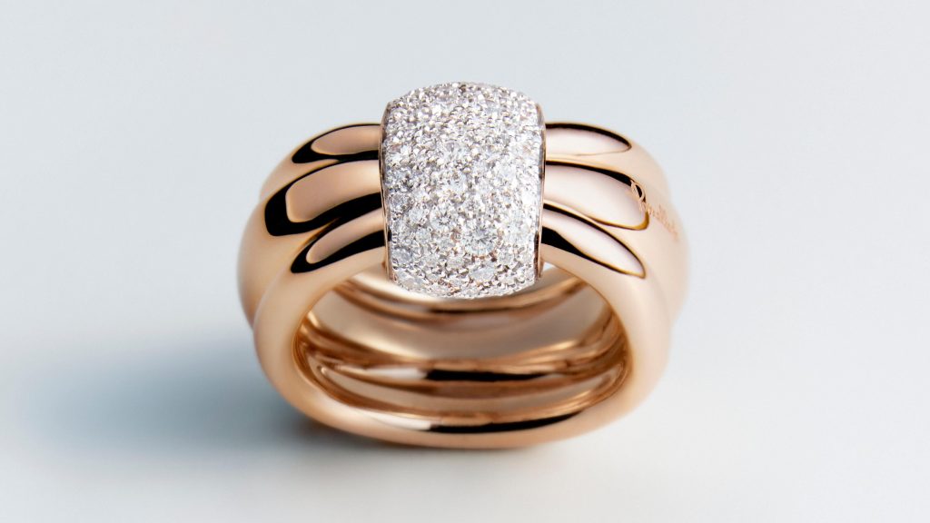 Pomellato Together系列推出两款新作,以璀璨白钻焕新演绎隽永设计,诠释日常优雅,并定格每一个闪耀情感光芒的真挚时刻。 新款Pomellato Together 戒指兼具雕塑美感与柔润质感,抛光玫瑰金带缠绕交织,环绕着镶嵌不规则密镶白钻的链节。此时,钻