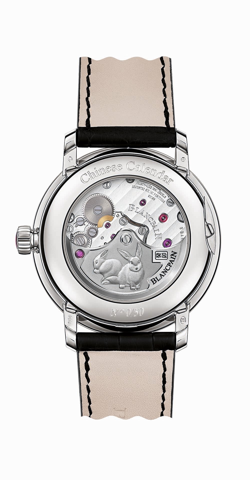 宝珀每年推出的中国年历限量版腕表,若只是从正面不会看出有任何分别,但当把腕表反过来时,便能够通过透明底盖看到18K白色金摆陀上镌刻了该年的生肖图案,而今年的则是一雄一雌的两只小兔。此外,当进入正月初一时,能够显示各种中国年历资讯的表盘上,12时位的生肖显示窗口将会变为一只兔子。
