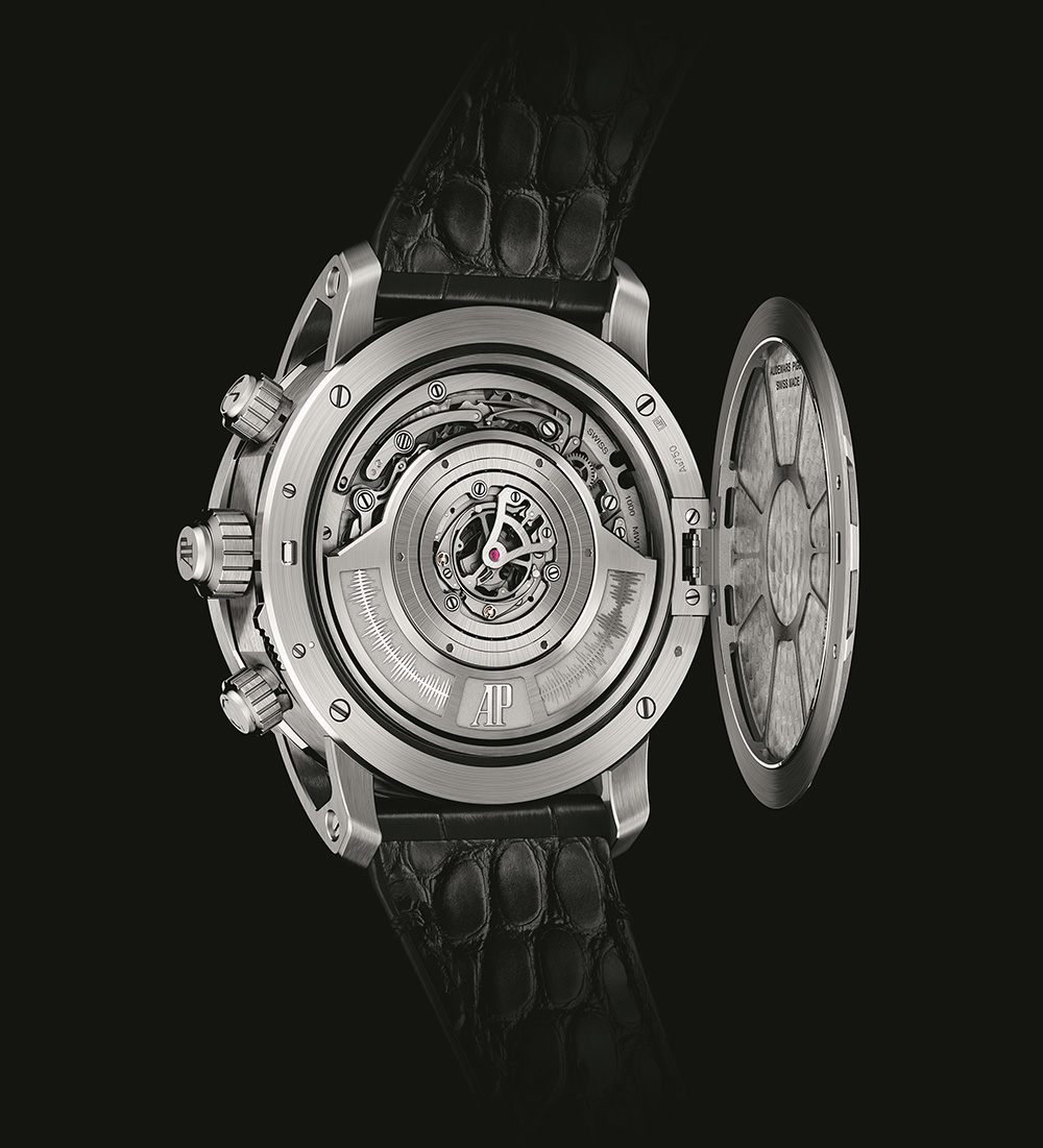 表带:黑色鳄鱼皮表带搭配18K白金AP字样折迭表扣。另附黑色纹理橡胶涂层小牛皮表带